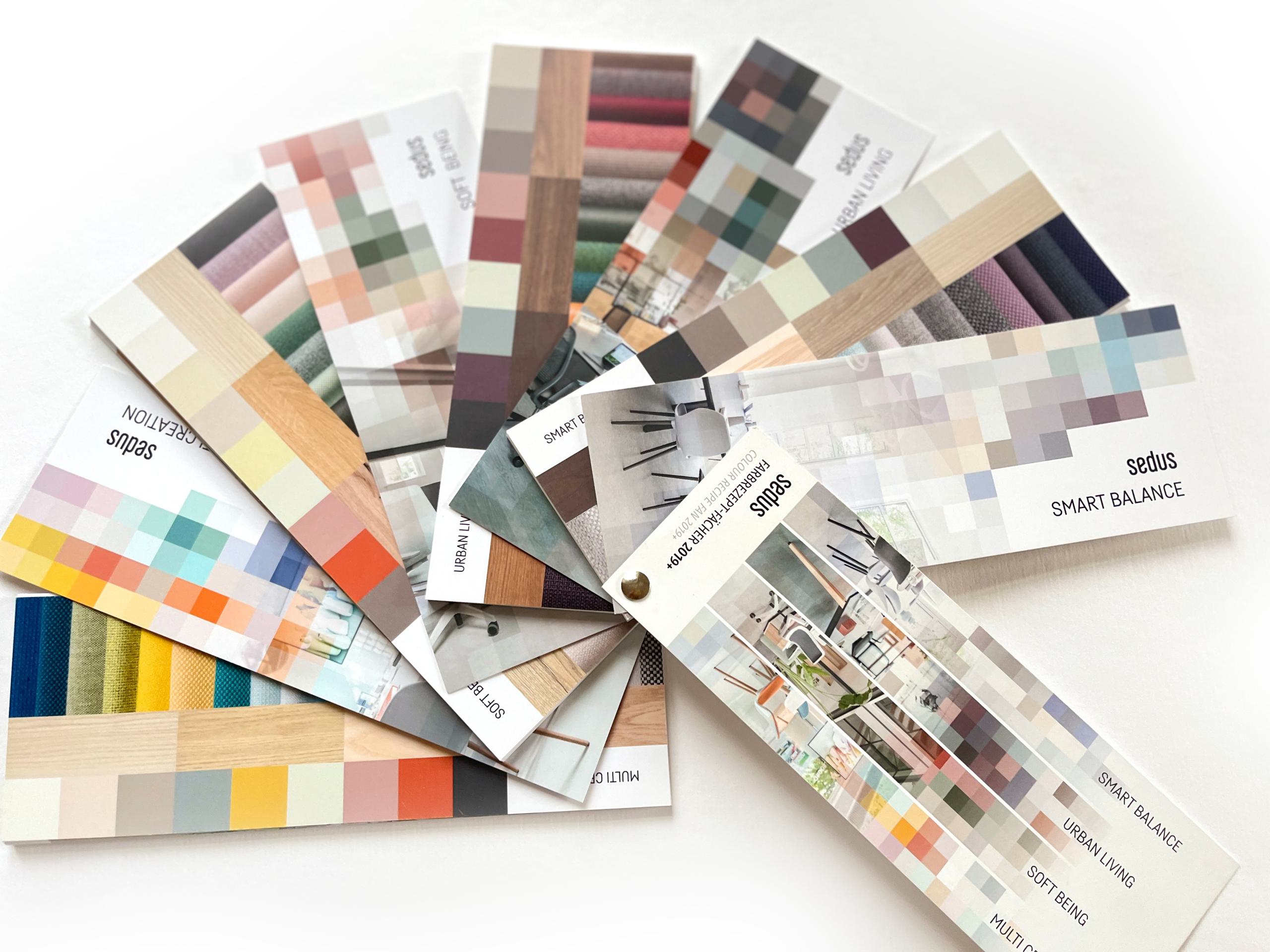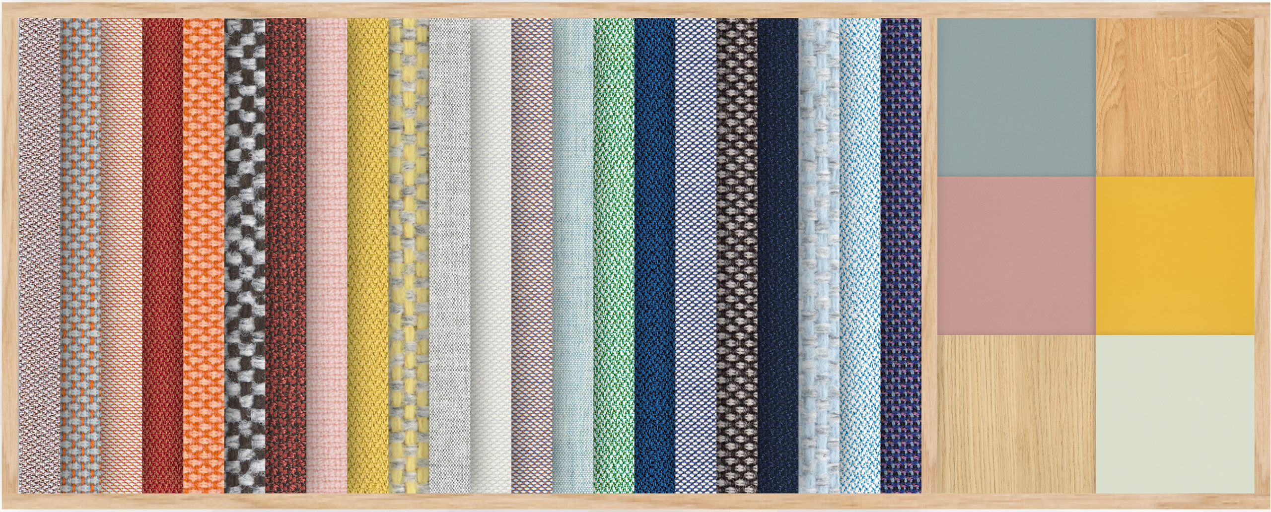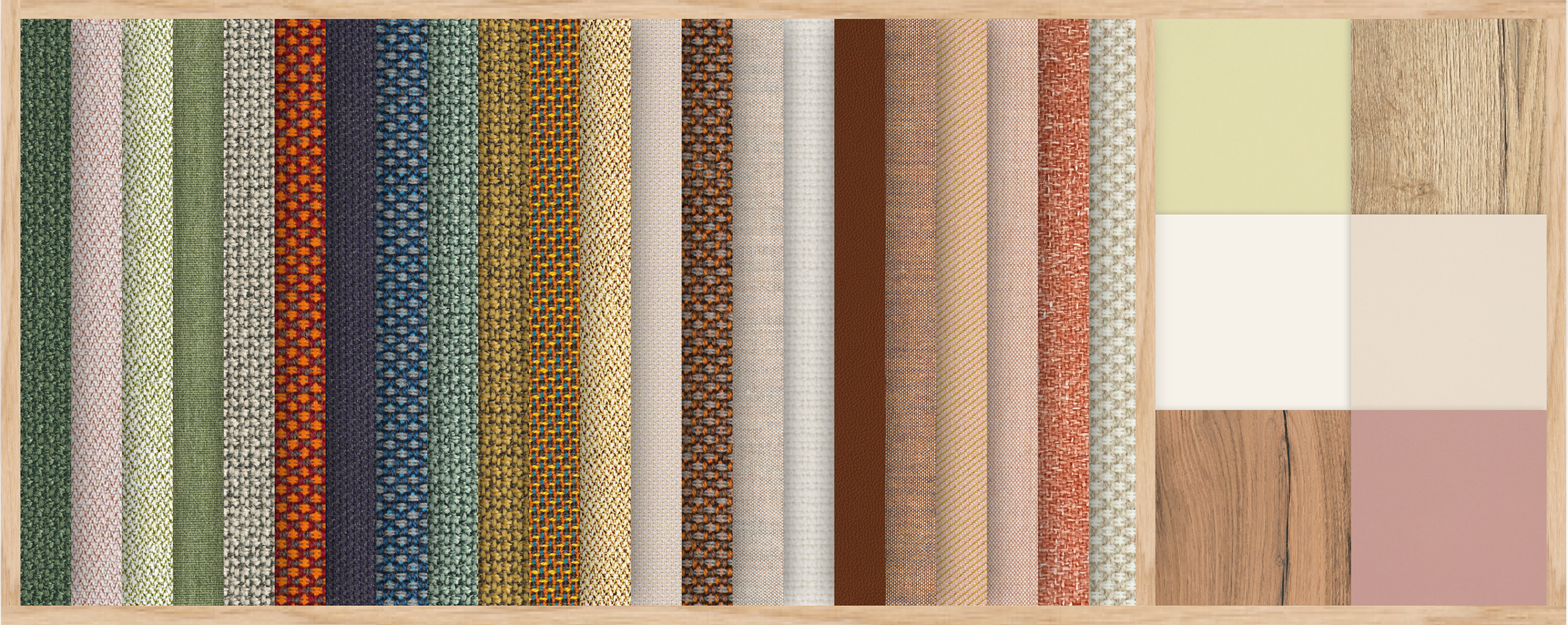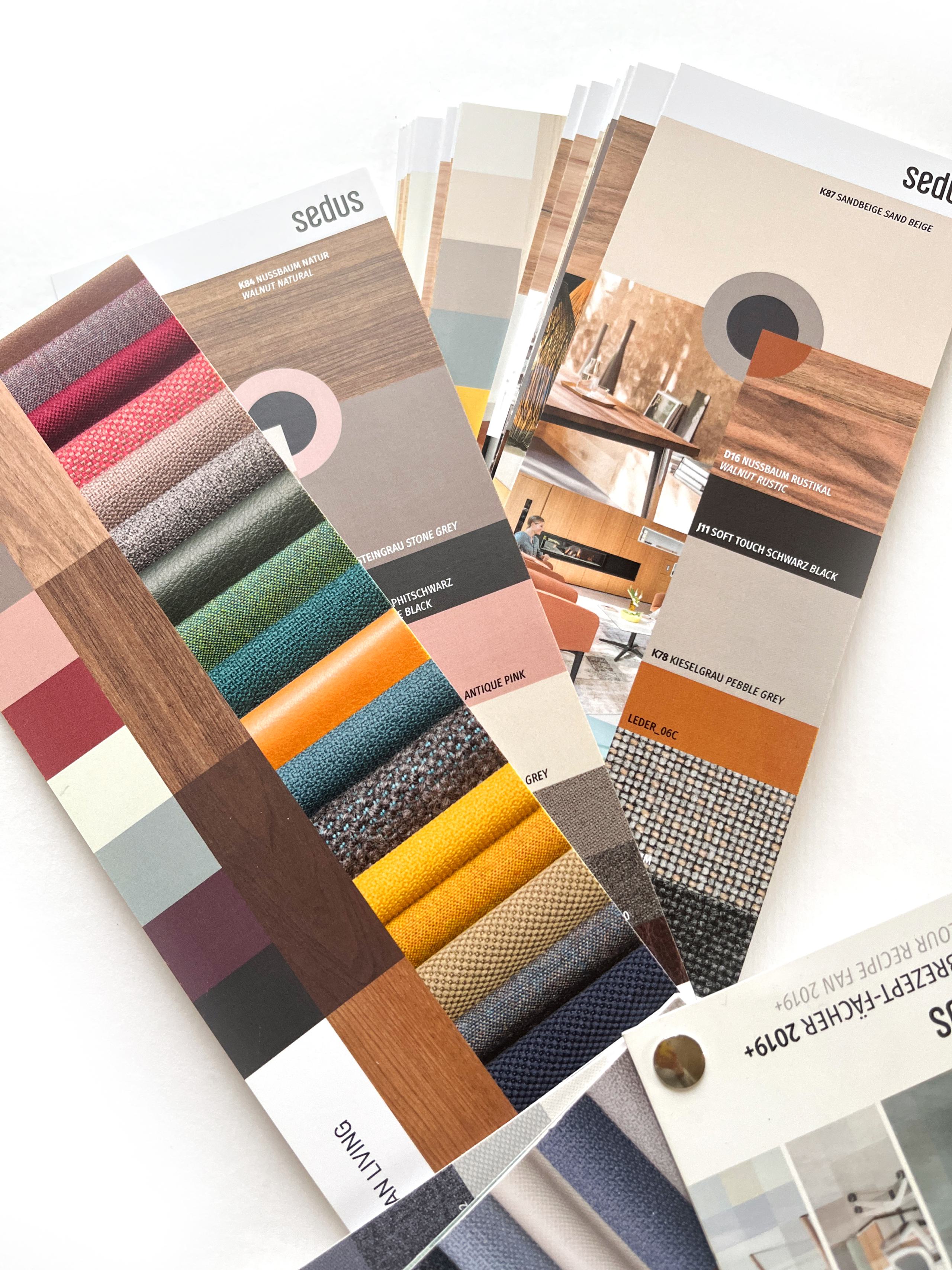 Die Farb- und Textiltrends sollten in einer aktualisierten Bezugsstoff- und Oberflächenkarte umgesetzt werden. Dazu wurden in mehreren Steps bisherige Stoffe und Möbeloberflächen (Farbe und Material) analysiert und nach neuen Trends gescouted, um daraus in einem gemeinsamen Monitoring- und Clusterprozess eine farblich ausgeglichene Kollektion zu entwickeln. Diese ist trendgerecht, zeigt aber auch zeitlose Farben, Holzarten und Texturen.