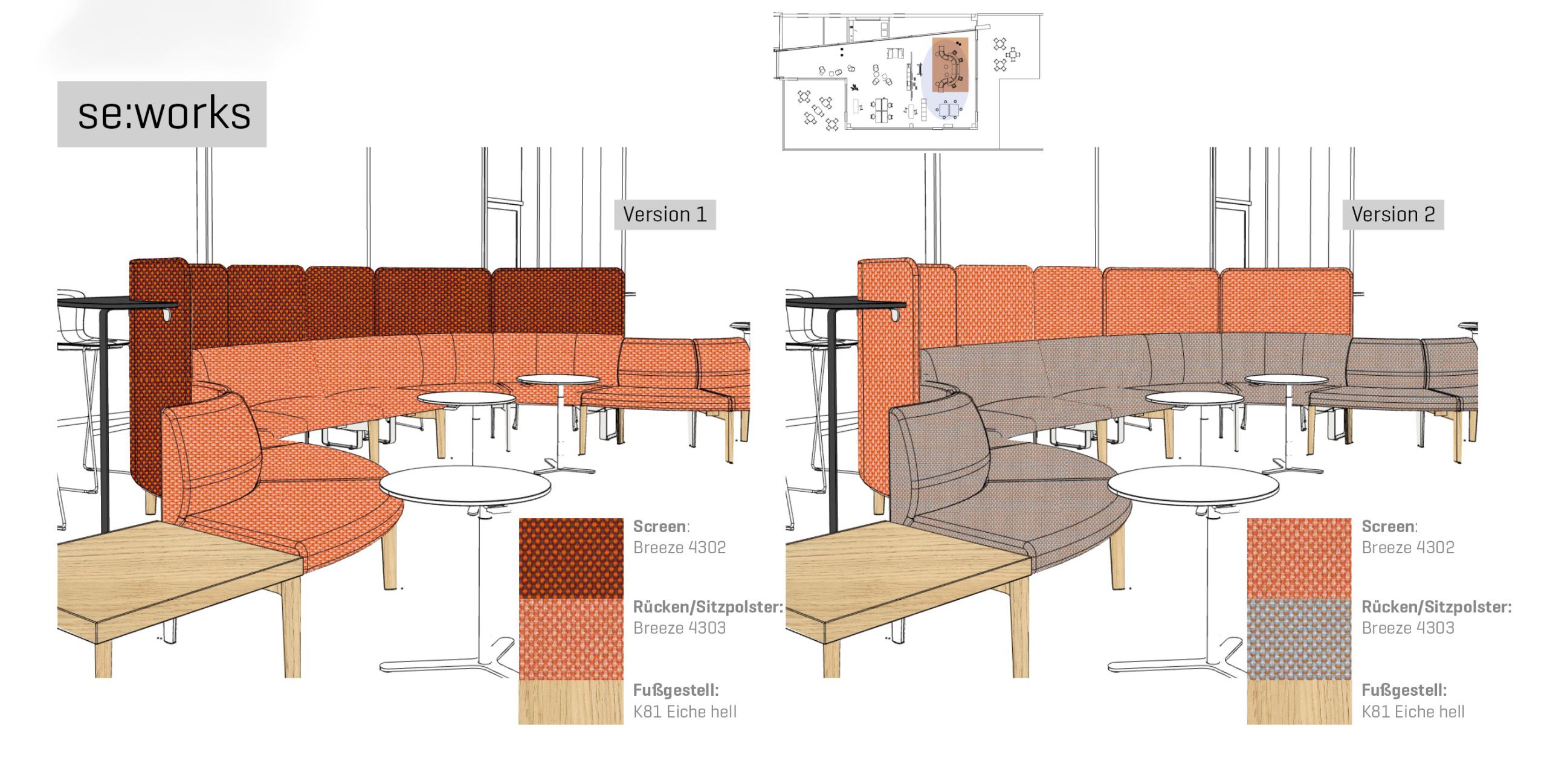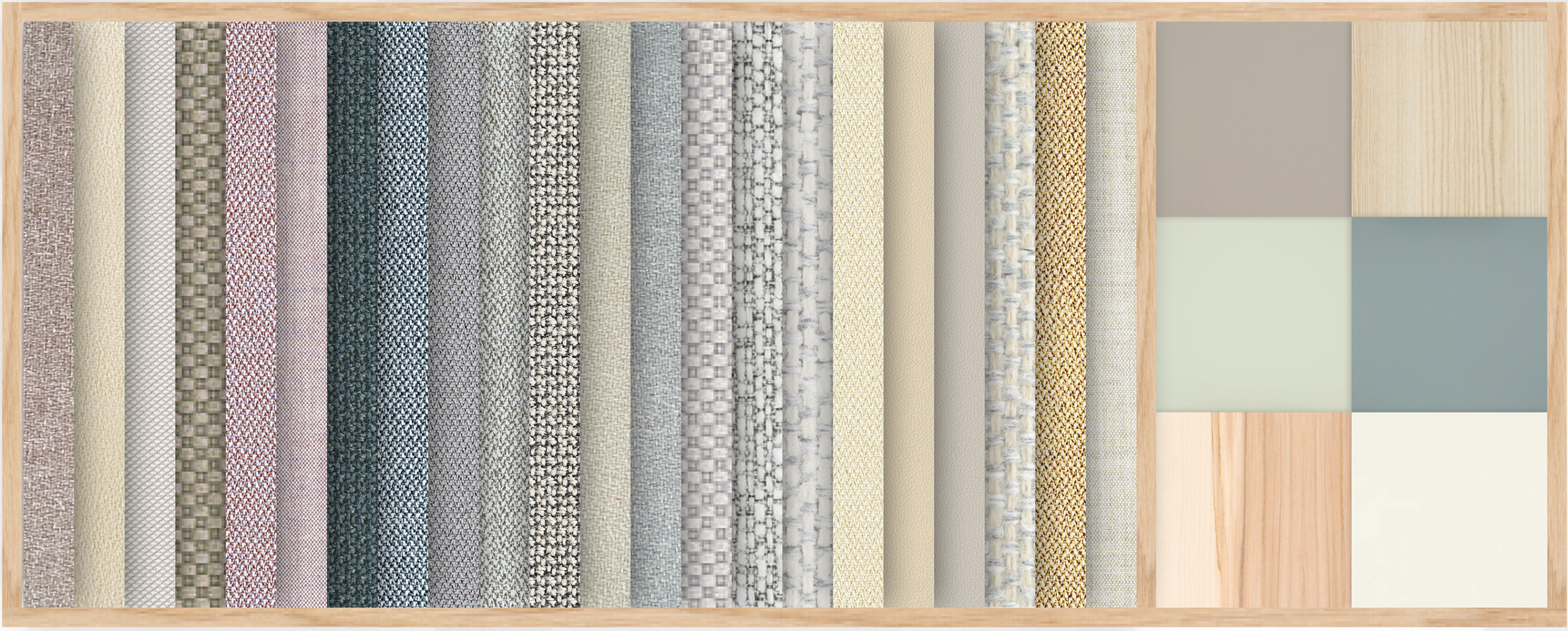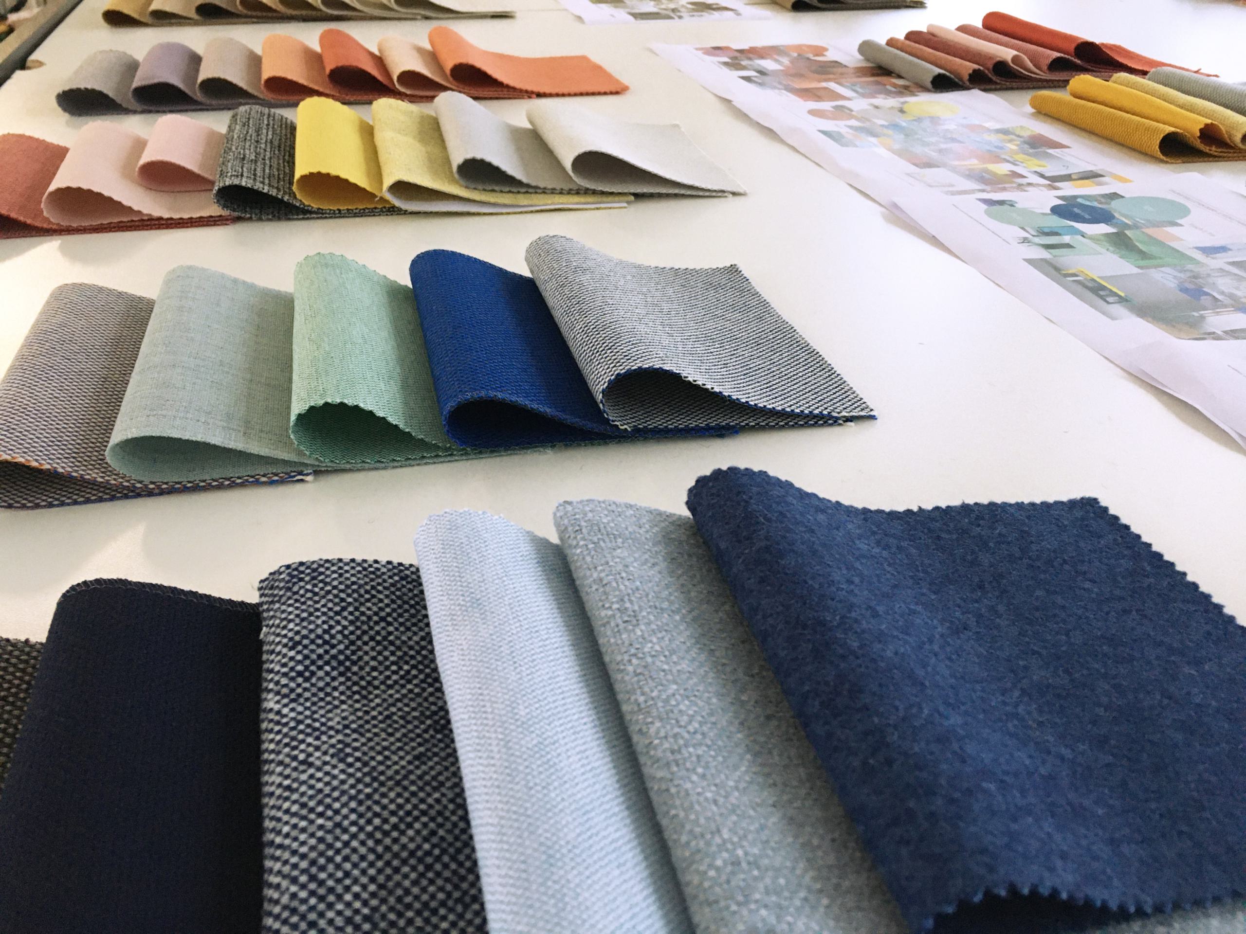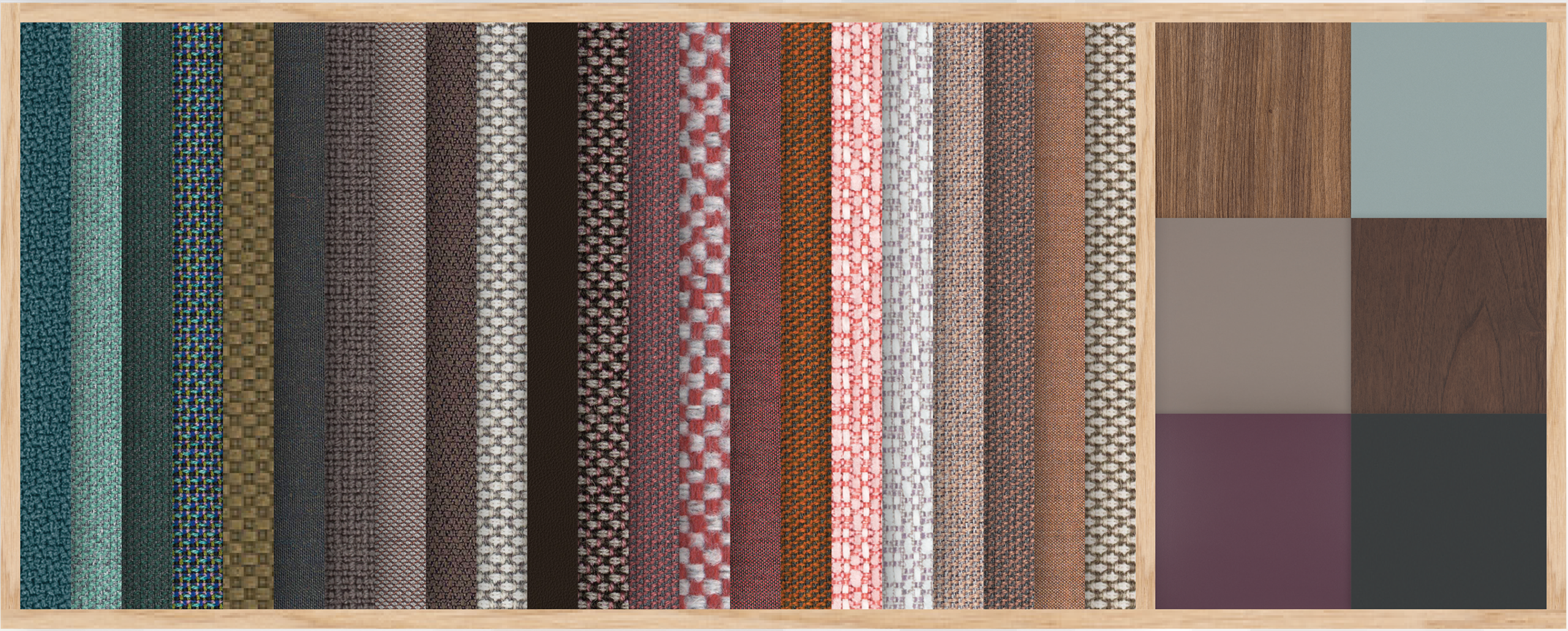 Die Farb- und Textiltrends sollten in einer aktualisierten Bezugsstoff- und Oberflächenkarte umgesetzt werden. Dazu wurden in mehreren Steps bisherige Stoffe und Möbeloberflächen (Farbe und Material) analysiert und nach neuen Trends gescouted, um daraus in einem gemeinsamen Monitoring- und Clusterprozess eine farblich ausgeglichene Kollektion zu entwickeln. Diese ist trendgerecht, zeigt aber auch zeitlose Farben, Holzarten und Texturen.