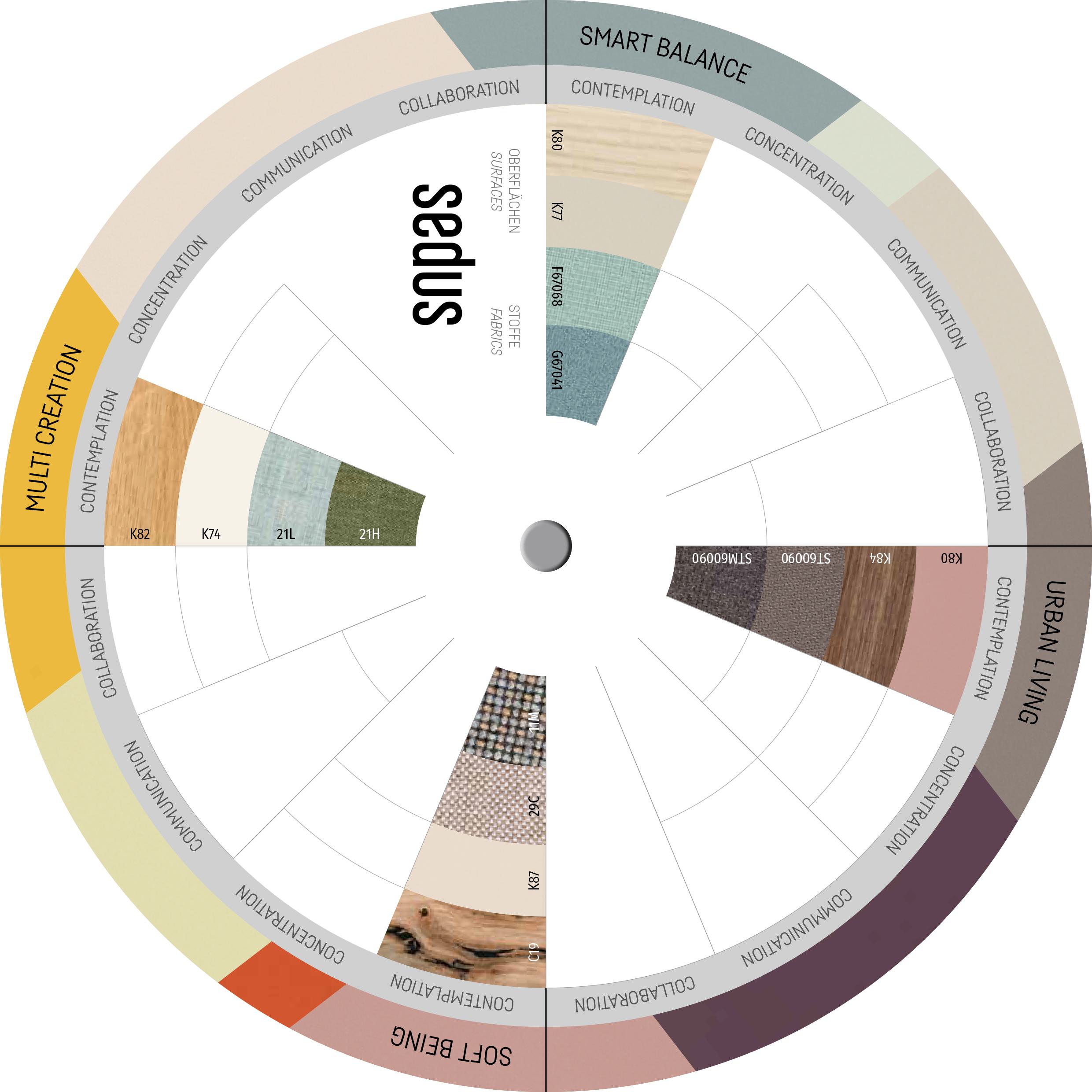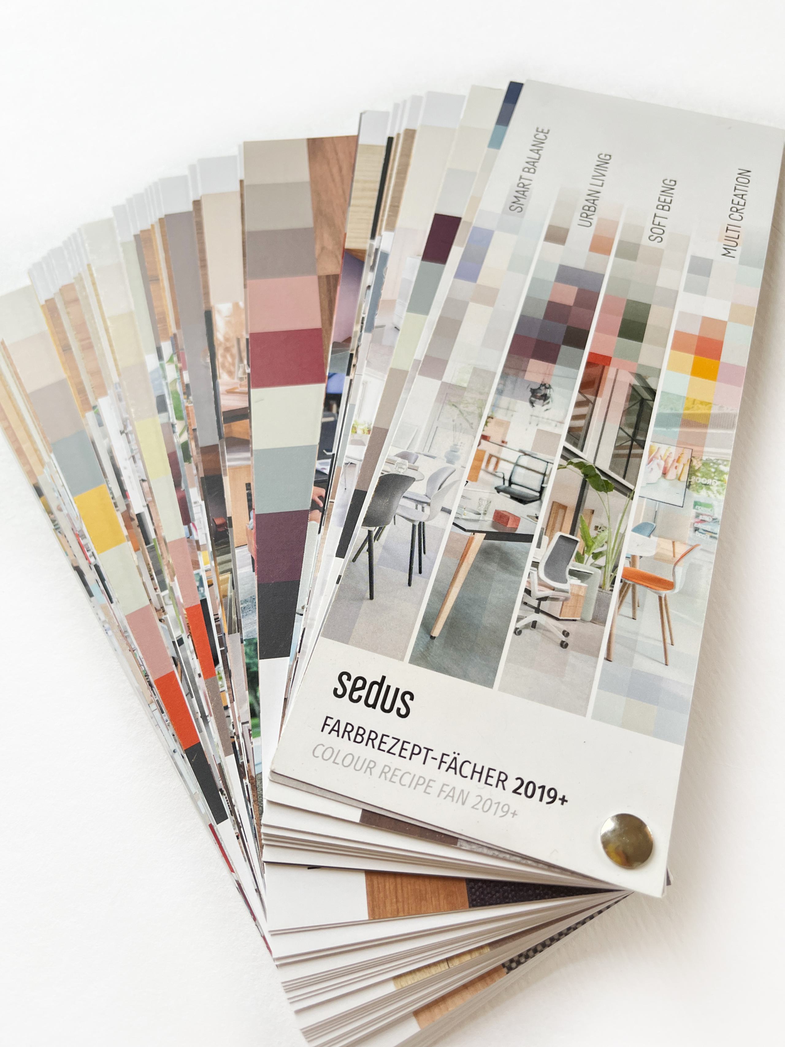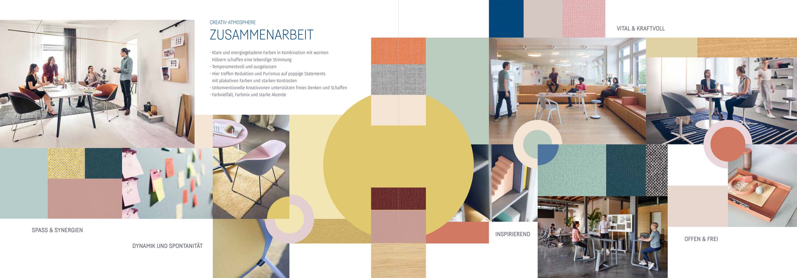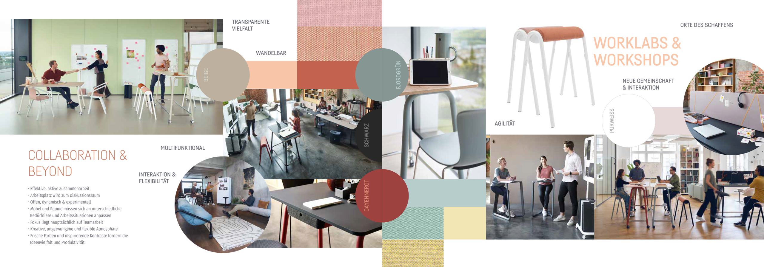 Um die Trends noch greifbarer zu machen, wurden verschiedene Tools entwickelt, wie zum Beispiel das Farbrad, Moodboards und ein Rezeptefächer. Diese zeigen auf kreative und übersichtliche Weise trendgerechte Kombinationen aus Material, Farbe und Textil. Die Farbtrends wurden auf der Orgatec 2018, 2022 und 2024 erlebbar gemacht und die Trendwelten fanden in zahlreichen Shootings und Showrooms Anwendung.
